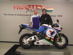 The New 2015 Joey Dunlop Foundation Tombola Bike is shown at the Annual Dinner. Conor Cummins drew the winning ticket of the 2014 Prize, the HM Plant McGuinness Replica was won by Steve Smith of Grimsby, England before unveiling the New Bruce Anstey Honda in the stunning Valvoline colours.