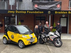 Trustee Barry Steels arrives on the island with John's first prize from the 2021 Tombola. The annual dinner was cancelled due to coronavirus and as a result the Honda CBR500RA was not on the island when the tombola draw was carried out. John is only the second winner the Foundation has had that lives on the island. The last island based winner was back in 2010, the year that the Charity opened the holiday apartments at Braddan Bridge House.